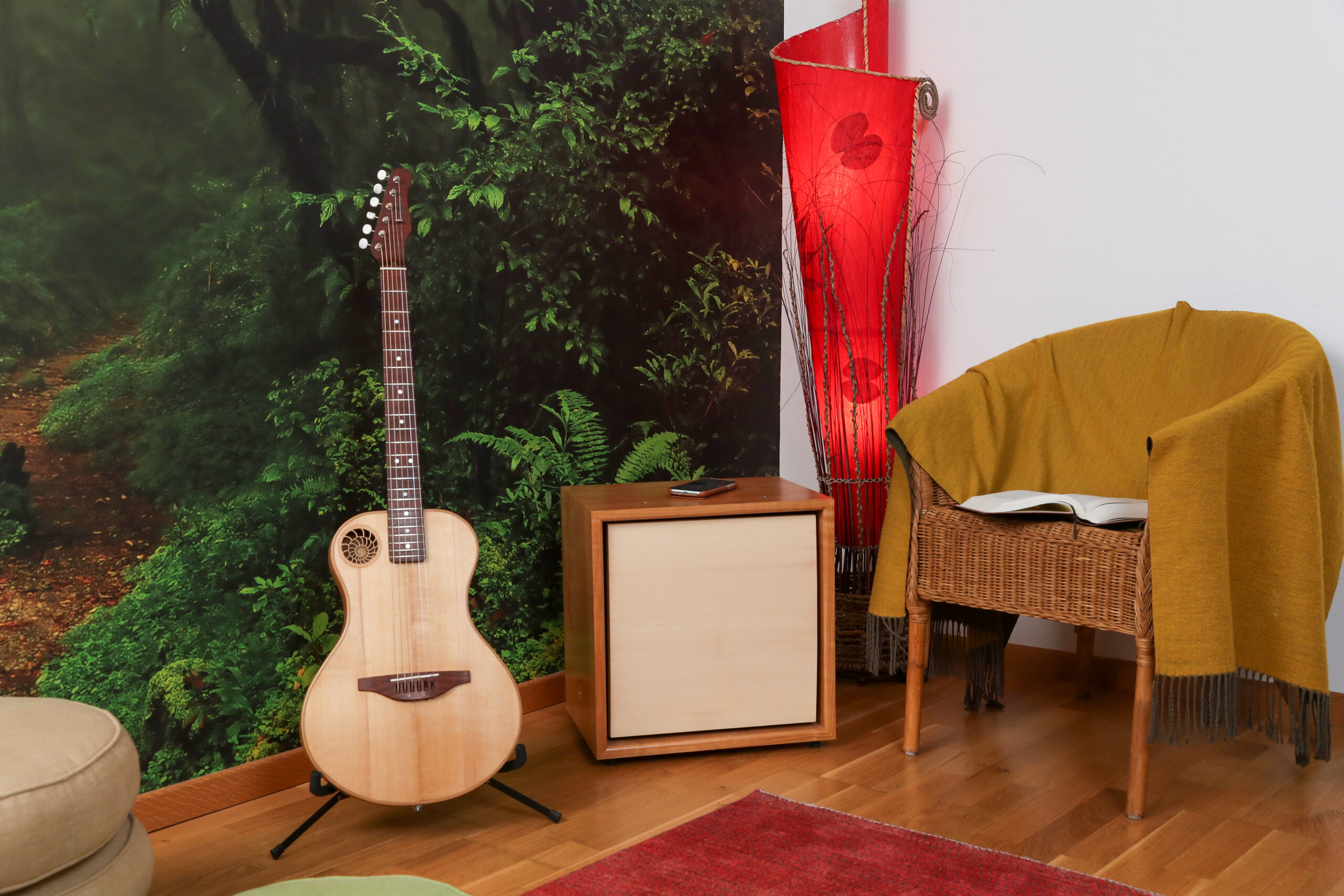 De ses expériences et riches rencontres lui est venu l’idée de créer, avec la même philosophie, un système de son mobile et actif. Une membrane en bois, pour amplifier un instrument avec une table en bois. Le compagnon idéal pour un musicien nomade et son instrument acoustique.