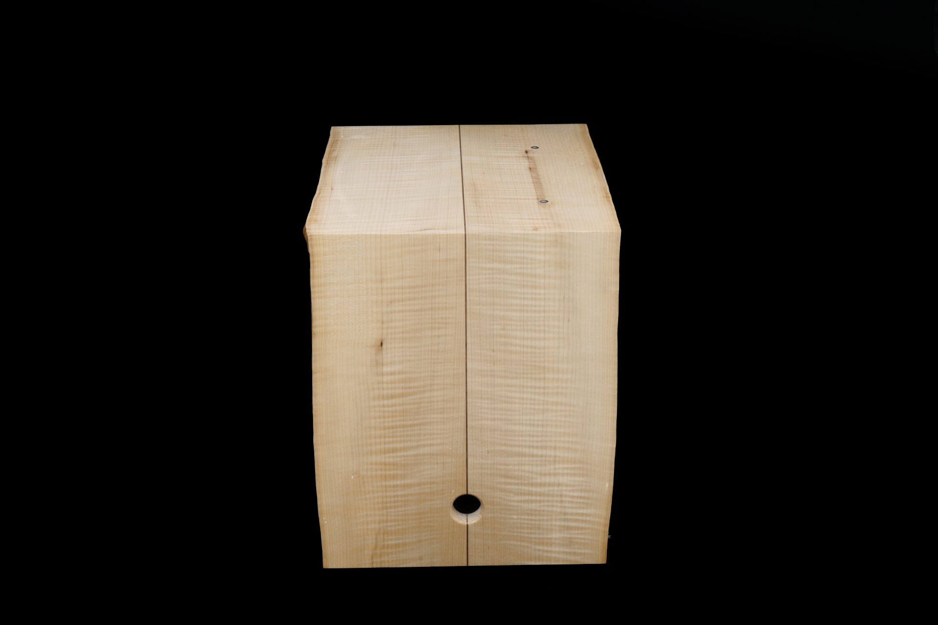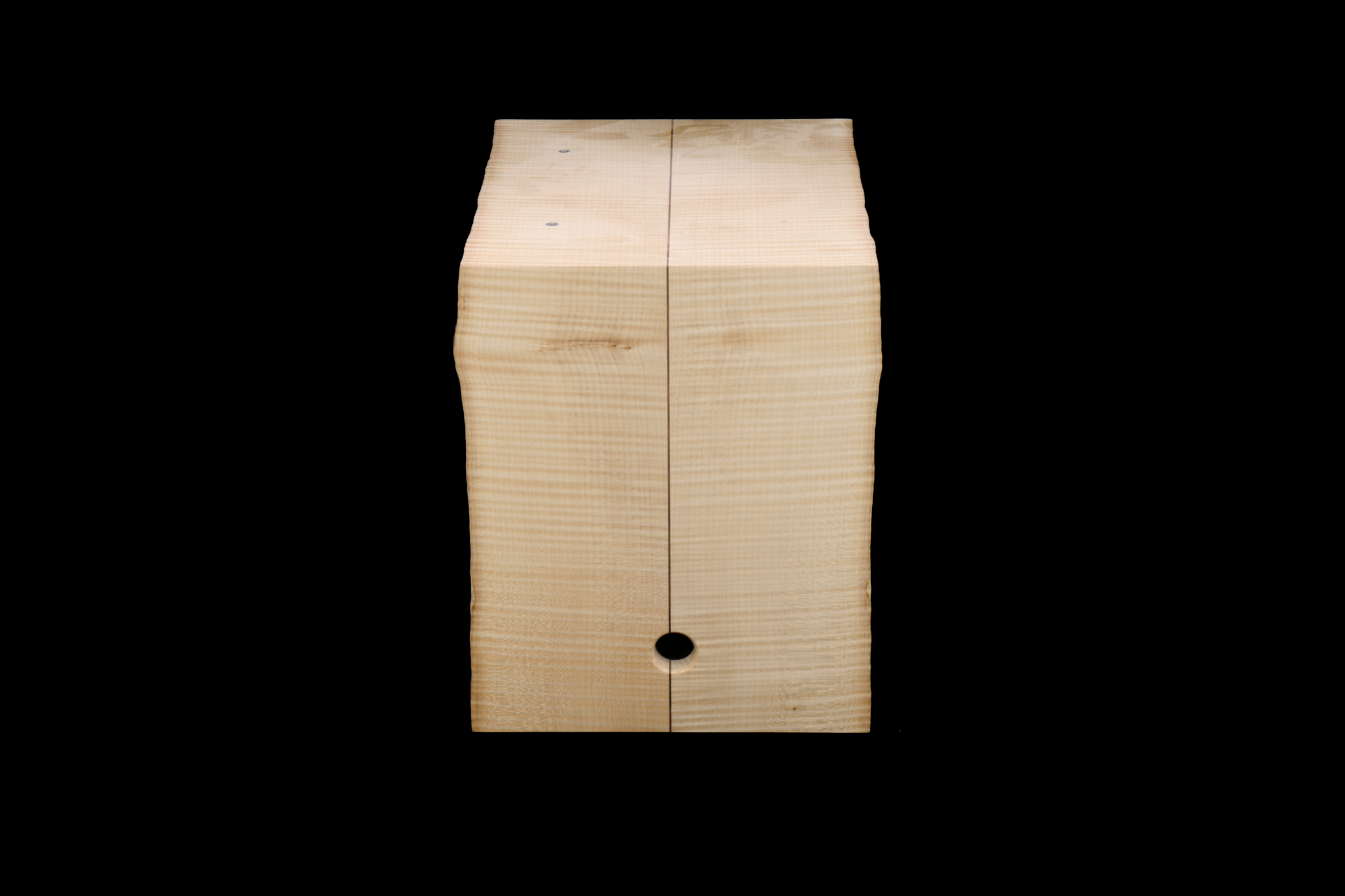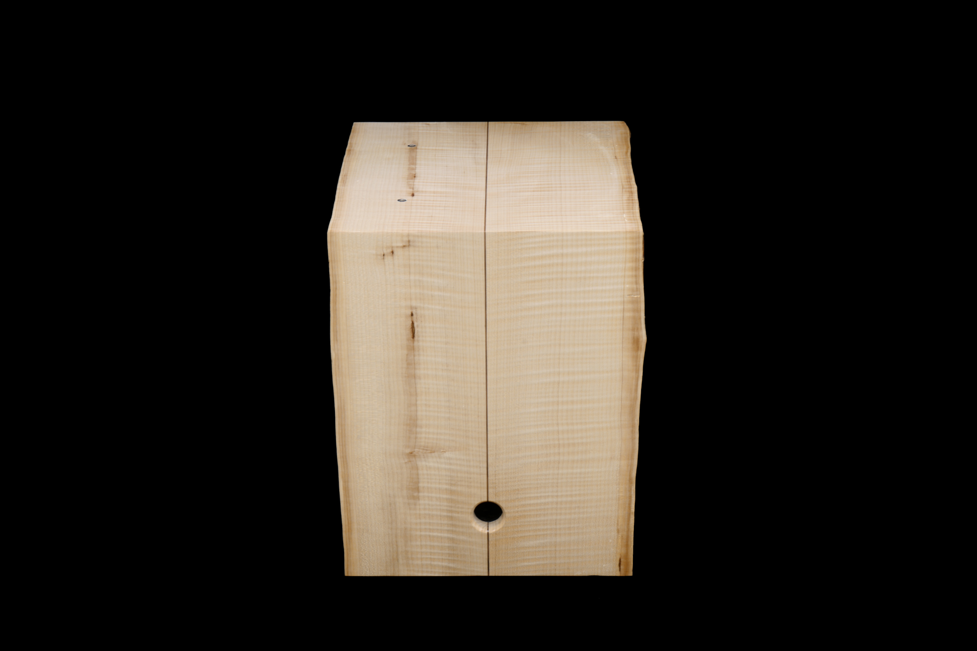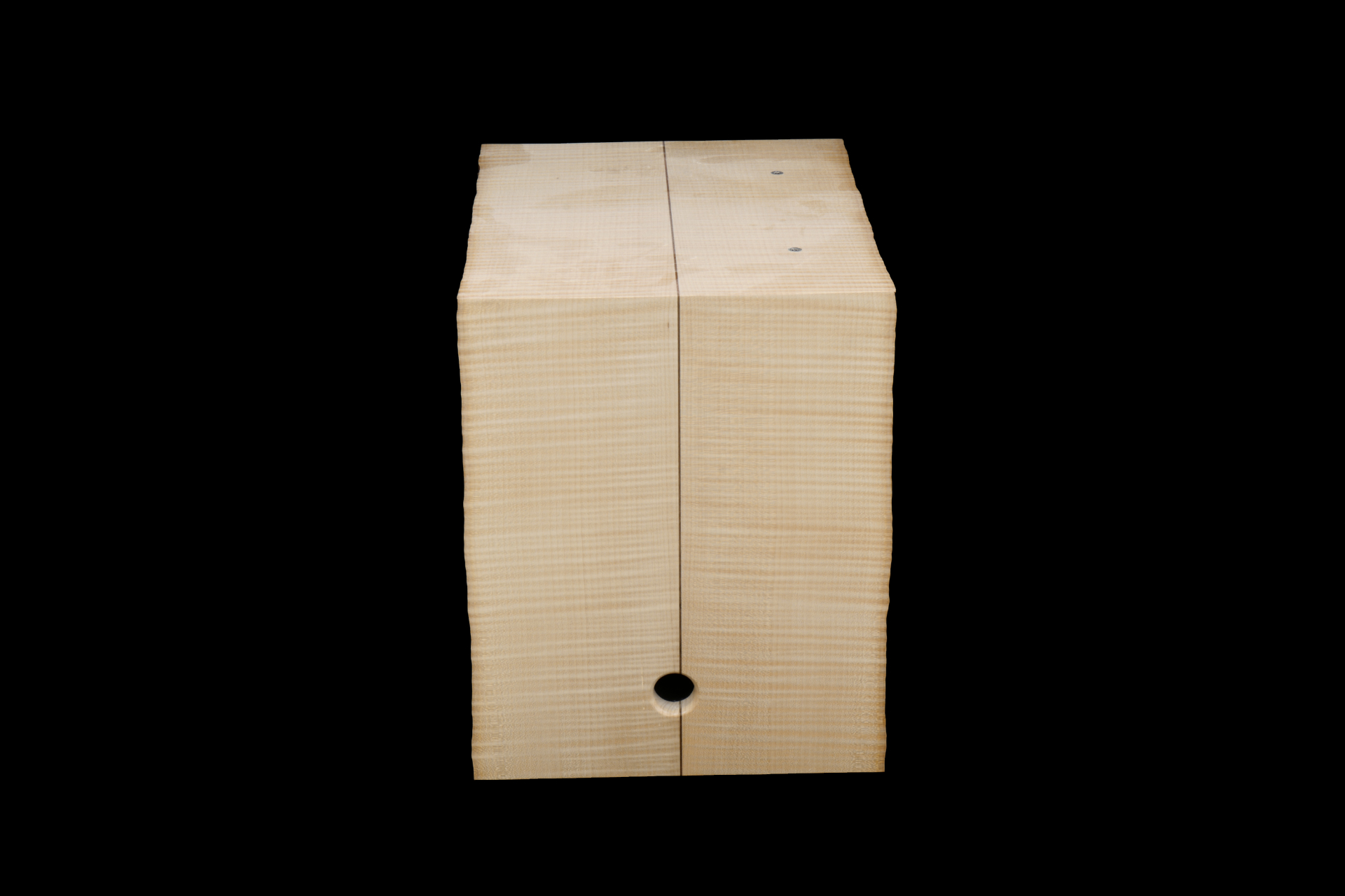 Erable massif ondé, 2 planches refendues symétriques, veines filantes sur 3 côtés, filets fins en noyer, 2 champs bruts.