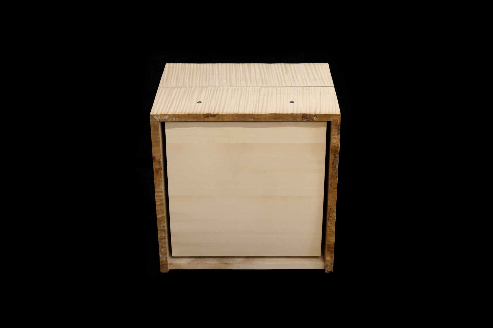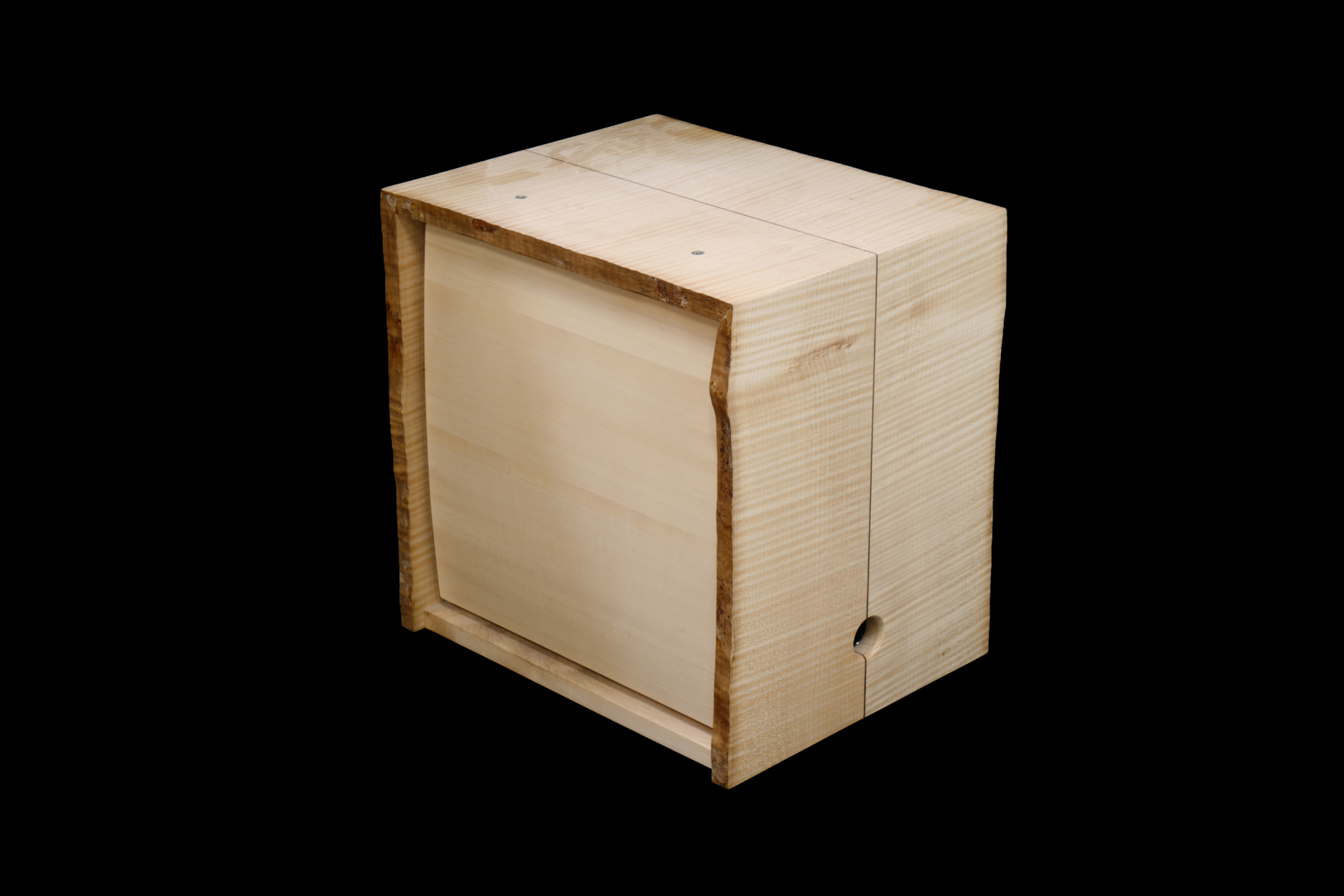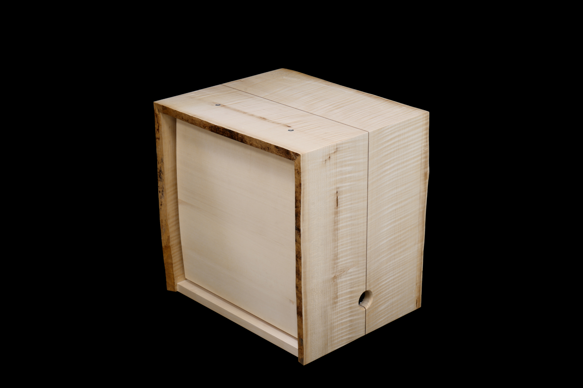 Erable massif ondé, 2 planches refendues symétriques, veines filantes sur 3 côtés, filets fins en noyer, 2 champs bruts.