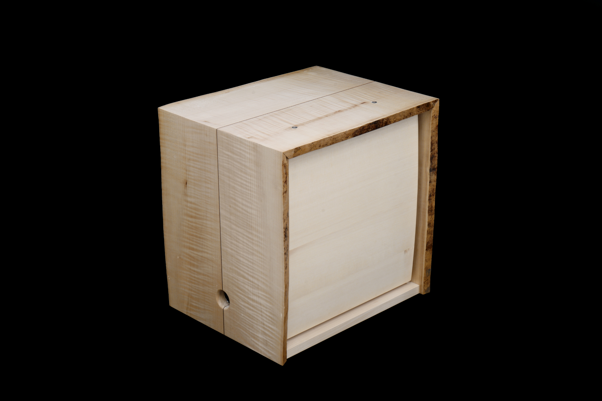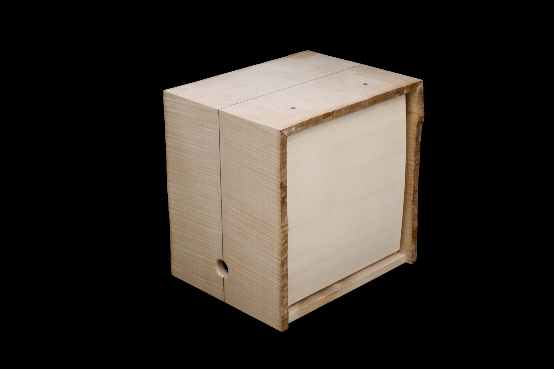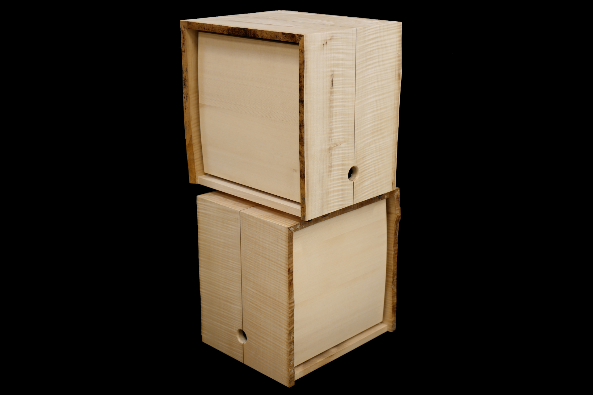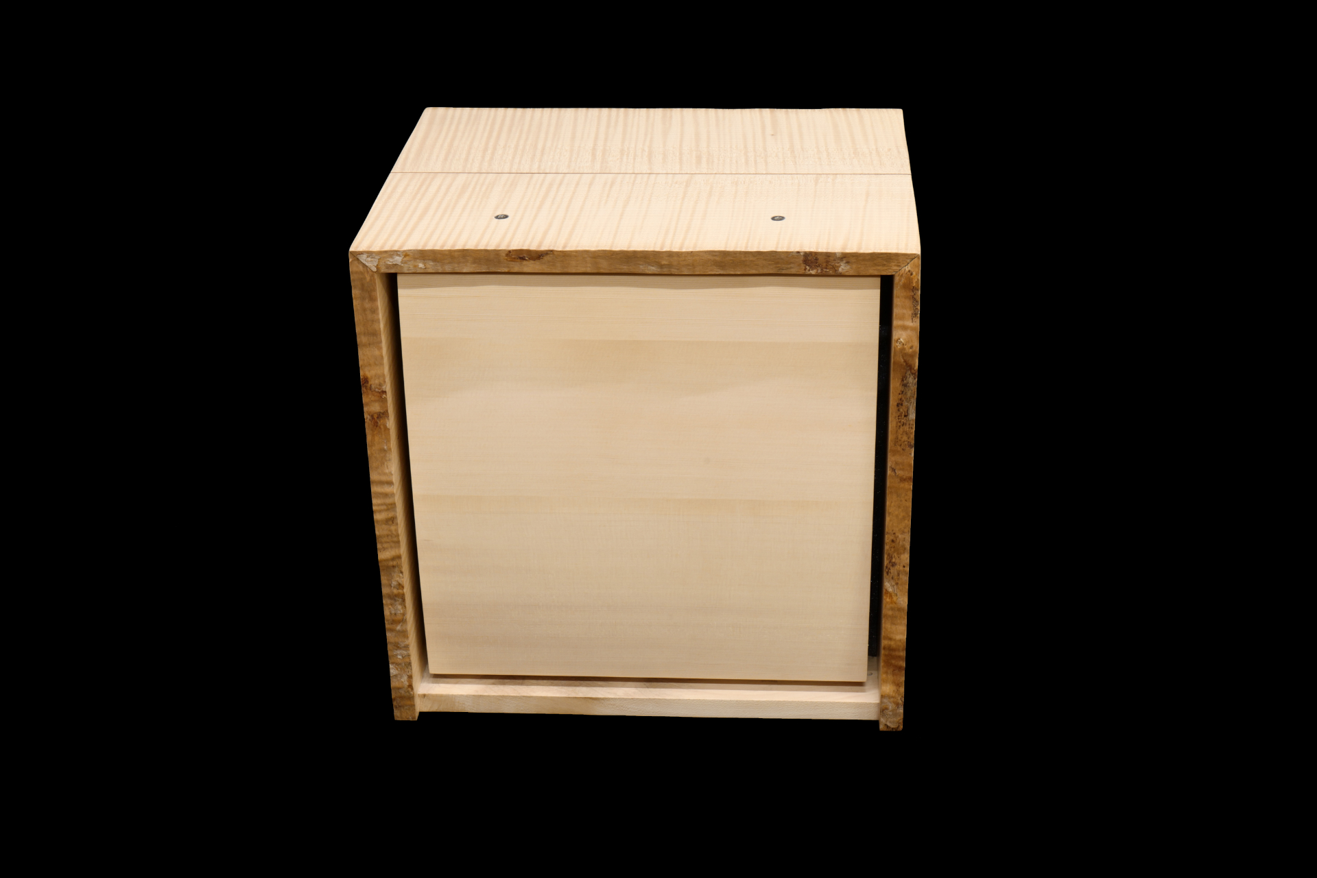 Erable massif ondé, 2 planches refendues symétriques, veines filantes sur 3 côtés, filets fins en noyer, 2 champs bruts.